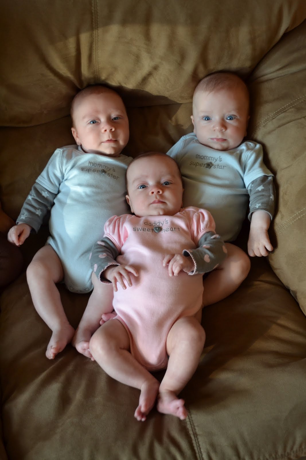 I switched from working days to nights the week of July 4th. I tried it for 2 weeks, but Sarah and I decided right now it is too hard for me to work nights because she has no help at night. I was looking forward to interviewing for the ANM spot on my floor, but I know now is not the time to work nights. Thanks to everyone who gave me the opportunity to attempt nights. Our friend Stephanie came over to see thr triplets with her husband and they brought them gifts. My cousin Tyler and Autumn welcomed a baby girl, Lexi, on July 12th. It will be fun to see her grow up with our kids as well as Olivia. On July 14th, Hunter decided to roll over from his back to his belly while at my Grandma and Grandpa Gescher's house (of course Sarah and I were in the other room, but my grandparents saw him do it). We continue to thank the Lord everyday for what amazing children we have and we are blessed to have such amazing families and help!